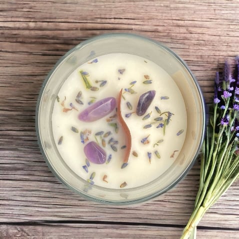 Aus gebleichtem Bienenwachs und Bio Kokosfett sowie Lavendel-Bio-Duftöl fertigen wir in einem Bodega-Glas, diese schönen Duftkerzen. Sie kommen mit einem geschwungenen Holzdocht sowie Amethysten und getrockneten Lavendelblüten. Das Glas hat einen Durchmesser von 8cm und eine Höhe von 6cm. Jede Kerze ist ein Unikat und wird in liebevoller Handarbeit gefertigt. Zum verschenken oder sich selbst beschenken. ❤️☺️